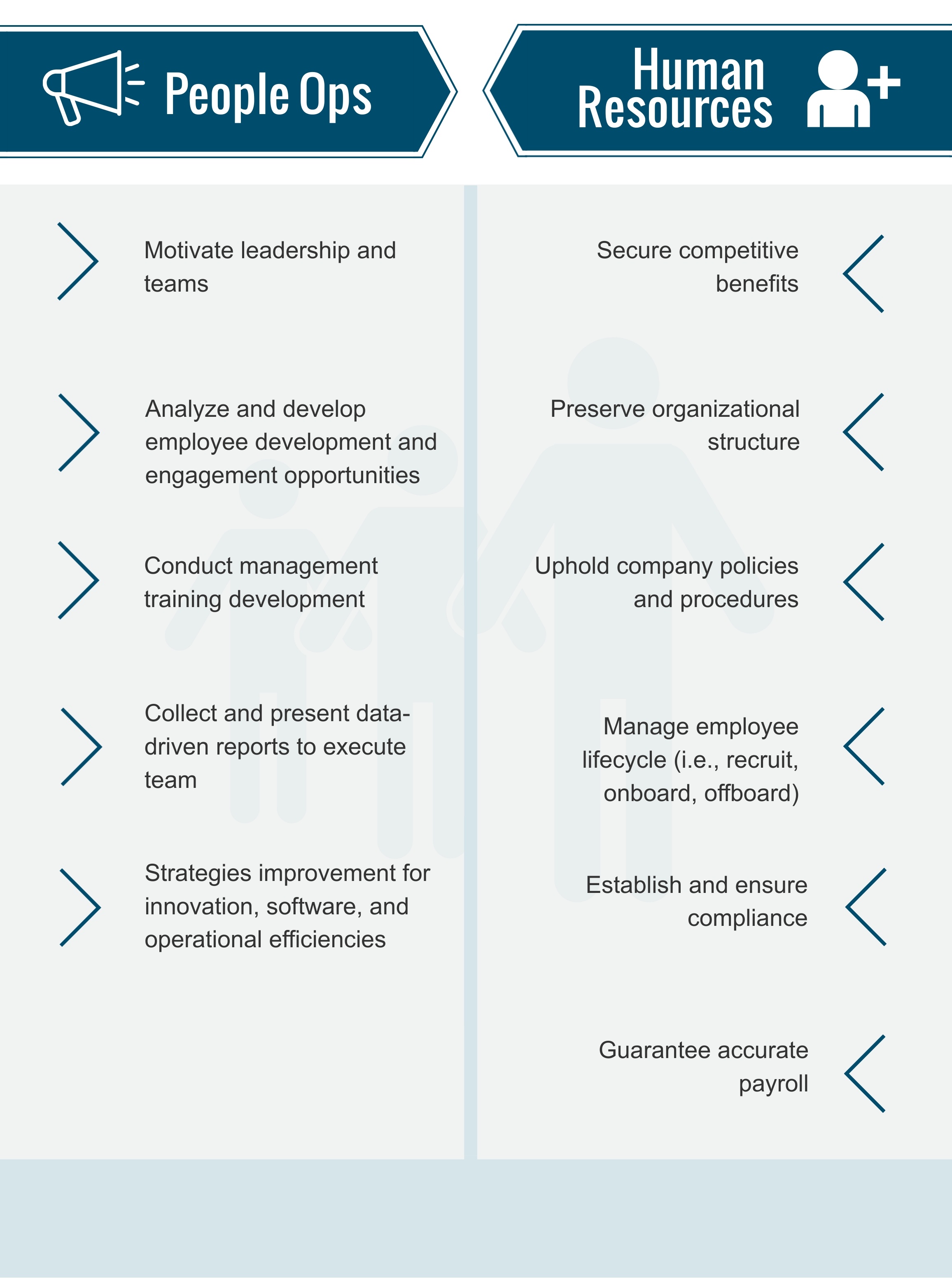 Generally speaking, most HR professionals agree that “people ops” and “HR” have similar duties and responsibilities. The main difference is in their approach. For example, a survey of approximately 50 individuals provided that people ops focus on effectiveness and development, whereas human resources focus on efficiency and compliance.